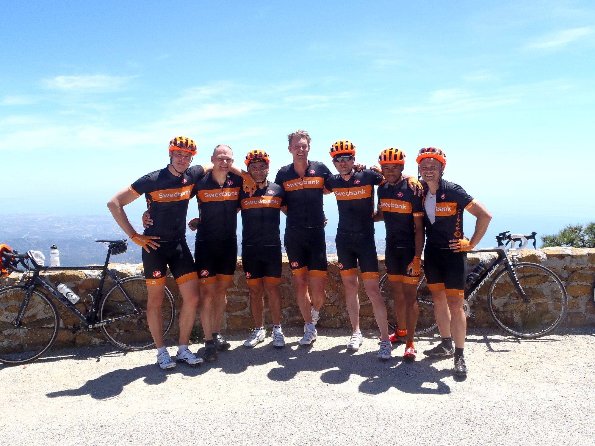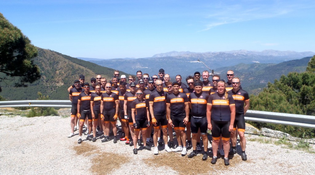Väl på toppen blev det såklart obligatorisk lagbild och ett beslut om att fortsätta vidare 4.5 km uppåt mot Los Reales som är topp nummer två på samma stigning. Fantastisk utsikt där uppe och man såg vägarna vi slitit på för att ta oss hela vägen upp till toppen runt 1220 meter över havet.