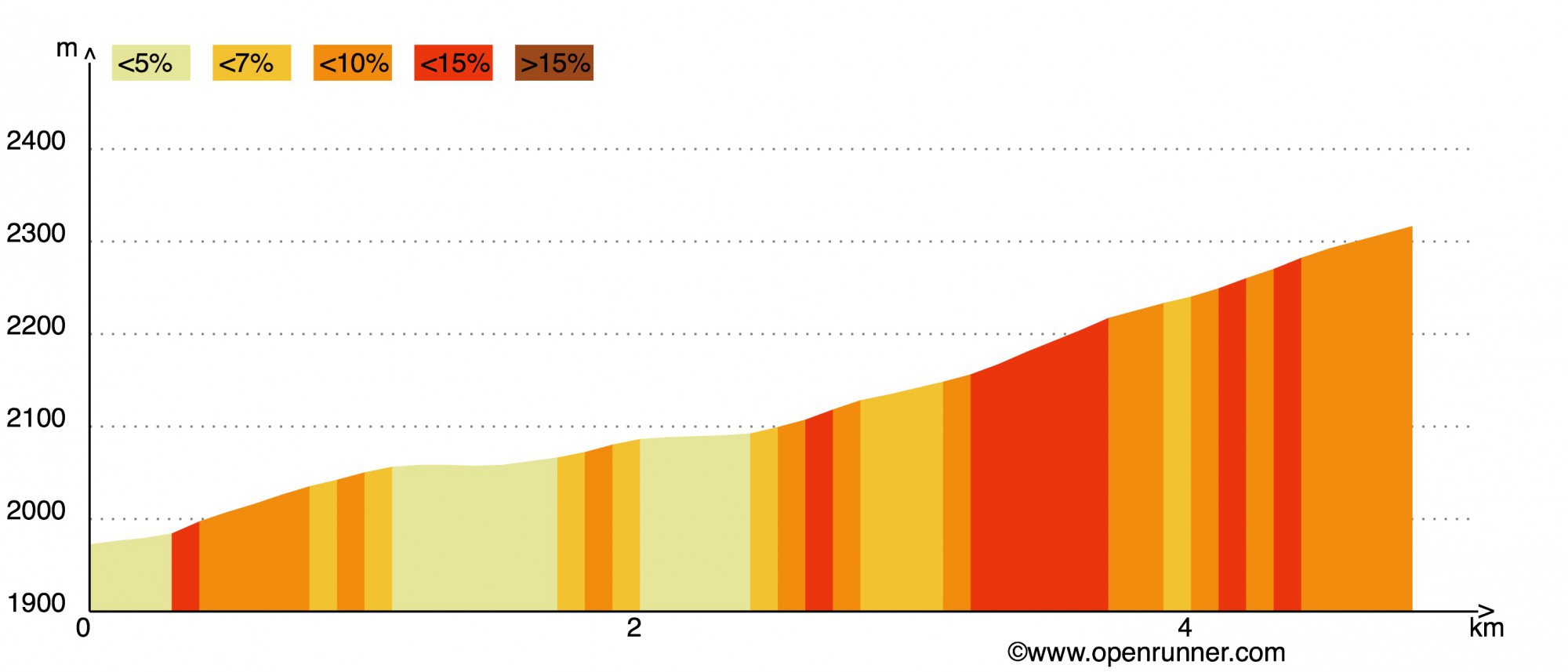 Forcola di Livigno, 2,315M (2nd category), 252M+ over 4.5KM, 5.6%